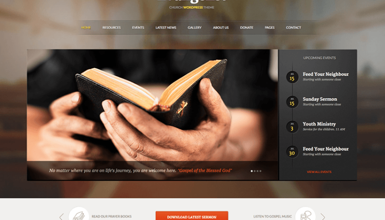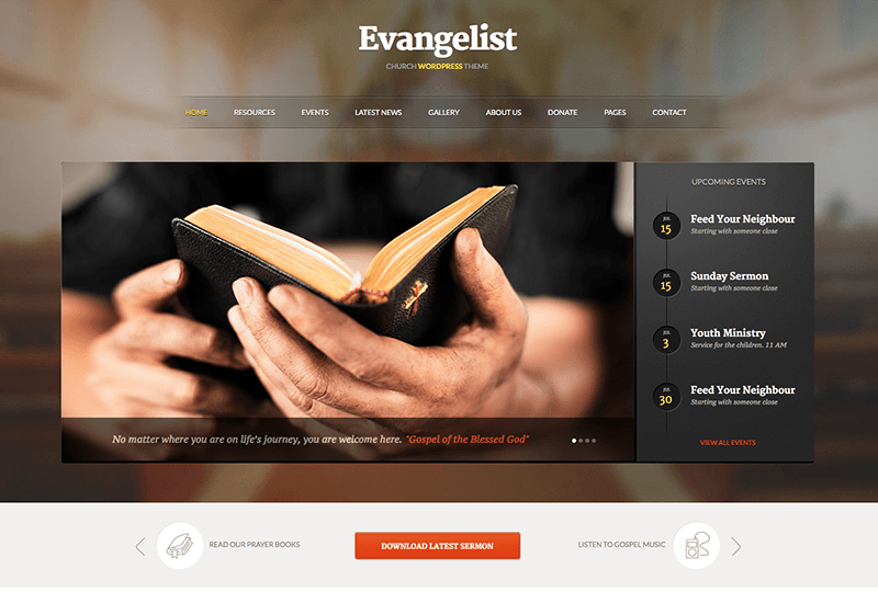 Evangelist — прекрасная церковная и некоммерческая тема WordPress, созданная ThemeFuse. Эта тема идеально подходит для благотворительных организаций, общественных групп, церквей и других некоммерческих организаций. Ключевой особенностью является календарь событий. Большинство церквей и благотворительных организаций построены вокруг сообщества людей, которые активно участвуют. С помощью подробного календаря событий с цветовой кодировкой вы можете информировать участников о предстоящих встречах, мероприятиях и сборах средств. Есть даже раздел о предстоящих событиях, который вы можете добавить на свою домашнюю страницу, чтобы посетители могли быстро увидеть, что происходит. Еще одна примечательная особенность Evangelist — возможность загрузки аудиофайлов. Это можно использовать для добавления загружаемых проповедей, песен, списков воспроизведения, памяток к собраниям, подкастов и многого другого. Каждый отображается с названием и кнопками воспроизведения / загрузки.