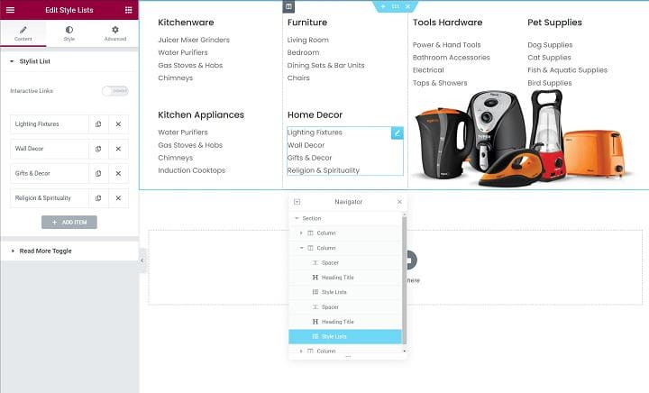 Вы можете видеть, что есть один родительский раздел для всего мегаменю, и мы добавили внутрь четыре столбца для управления различными столбцами в расширенном меню. Затем вы можете добавить любой контент, который хотите, используя все обычные виджеты Elementor.