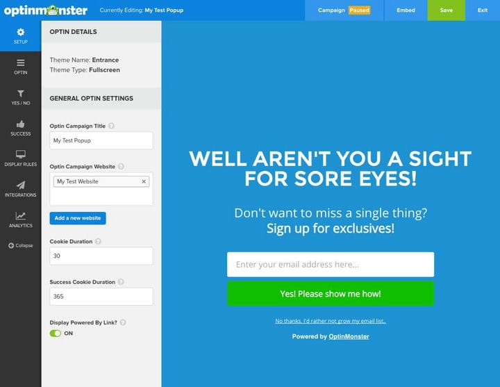 Фактическое создание подписки происходит на их веб-сайте, где вы можете использовать конструктор перетаскивания, встроенные параметры стиля (хотя они поддерживают настраиваемый CSS), мобильные параметры, настраиваемые эффекты и настройки кампании для создания всплывающих окон. Вы также можете выбрать один из общих параметров времени, а также более продвинутый выход, триггер прокрутки, бездействие, планирование и многое другое. Это в дополнение к возможности настраивать таргетинг на конкретных пользователей на основе рефералов, геолокации, устройства или даже файлов cookie для персонализированных кампаний.