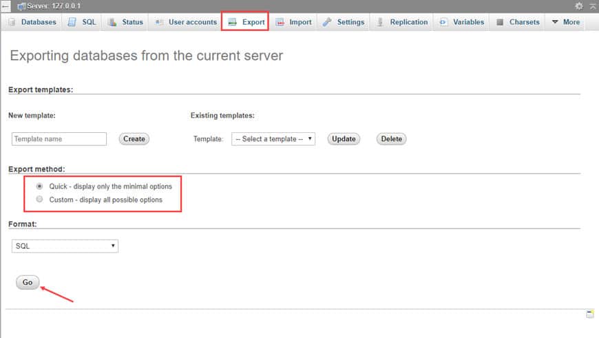 На панели инструментов phpMyAdmin нажмите «Экспорт». Таким образом вы сможете экспортировать свои файлы SQL. Измените метод экспорта на «Быстрый» и нажмите «Перейти».