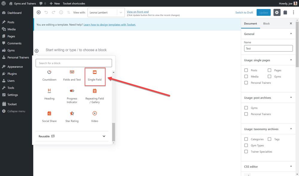 Перейдите к списку блоков Toolset и добавьте блок Single Field.