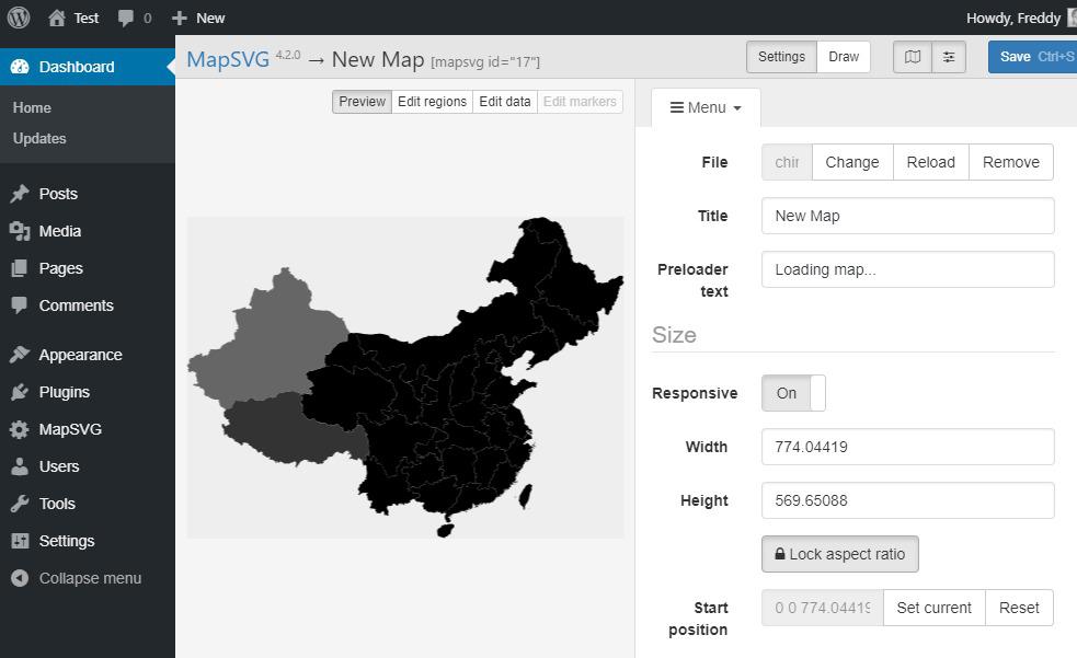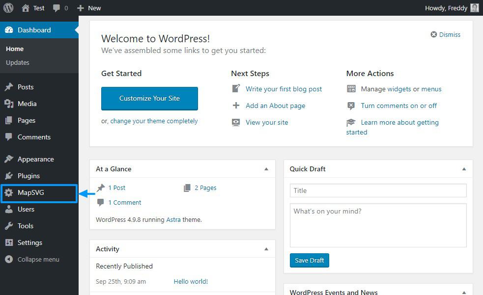 Вот и все; плагин готов к использованию после активации. Нажмите на элемент MapSVG в админке WordPress, чтобы запустить панель управления.
