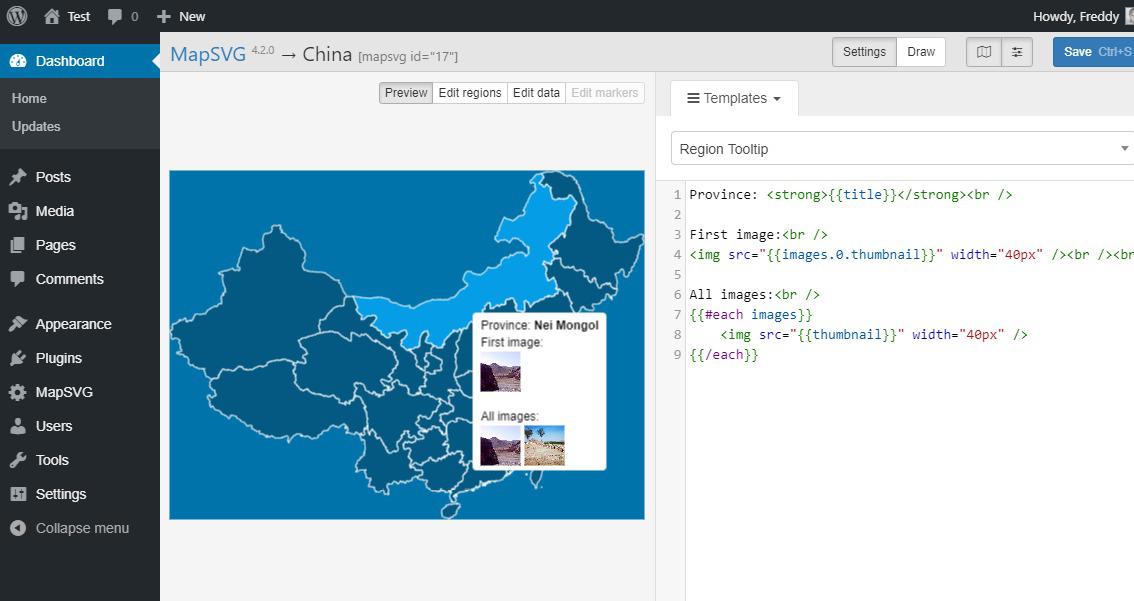 Затем нажмите кнопку MapSVG, как показано выше, и выберите свою карту. Это добавит шорткод [mapsvg id = «17 ″ title =» China «] на вашу страницу WordPress. В любом случае, не стесняйтесь добавлять карту в любом месте вашего сайта с помощью шорткода. Не волнуйтесь, карты, которые вы создаете с помощью MapSVG, на 100% адаптивны, что означает, что они будут отлично смотреться на нескольких устройствах.